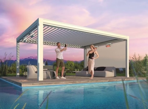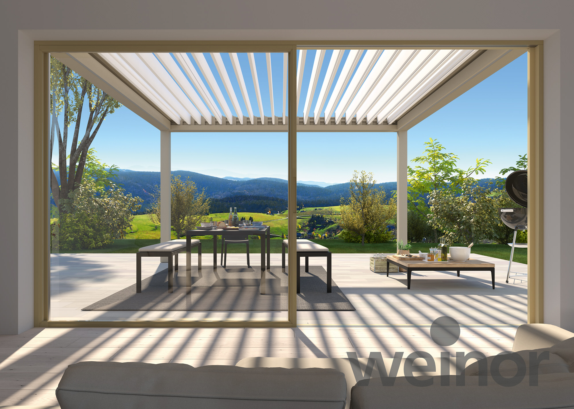 Durch das Öffnen der geräuscharmen Lamellen kann Warmluft entweichen und die Temperatur auf der Terrasse bleibt angenehm – Experten sprechen hier von einer bioklimatischen Wirkung.