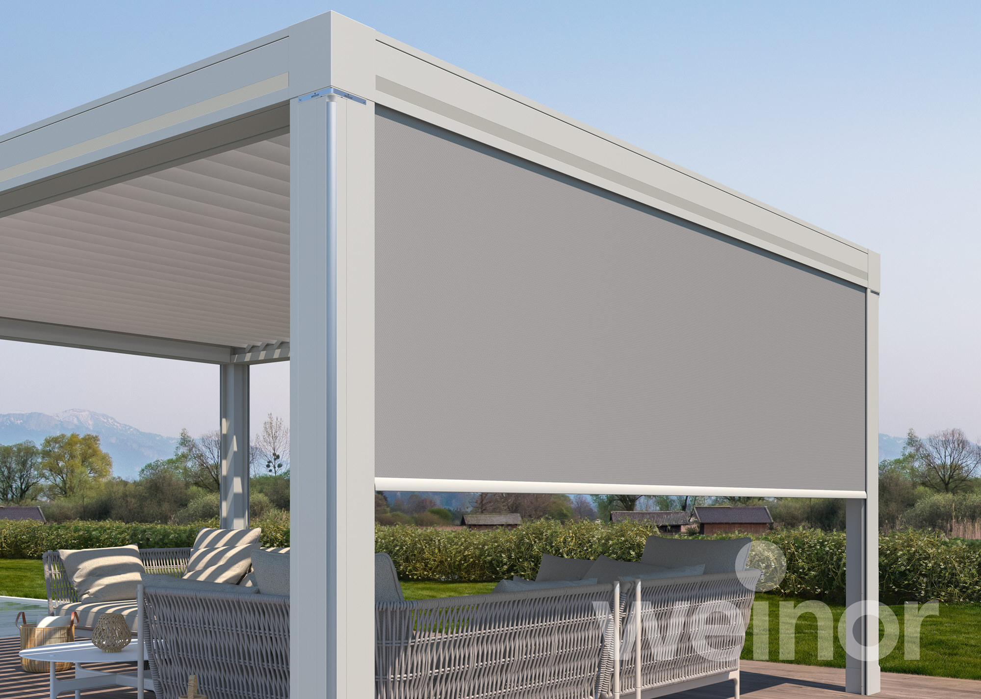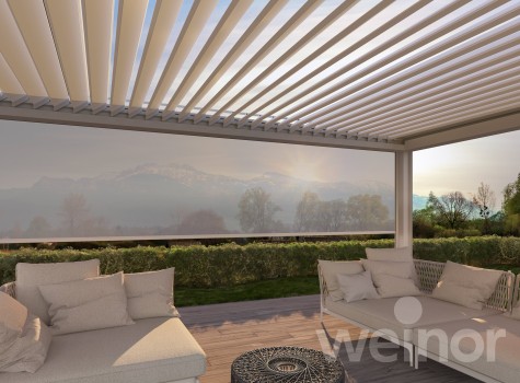 Das weinor Lamellendach Artares lässt sich an allen Seiten mit einer Vertikal-Beschattung ausstatten.