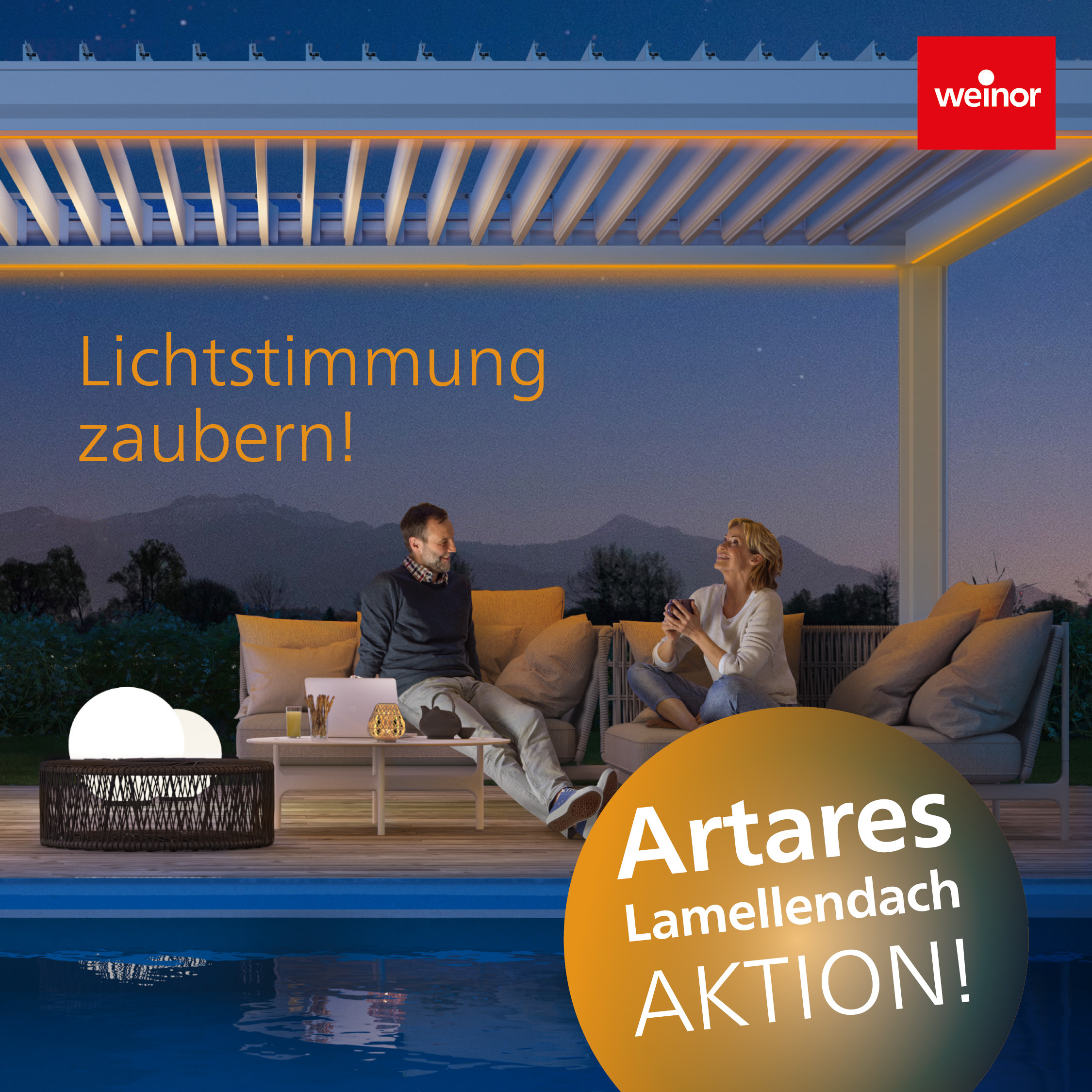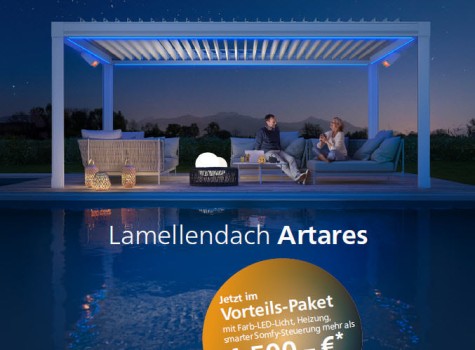 Sicheren Sie sich beim Kauf Ihres Artares Lamellendachs von weinor das Ambiente-Paket mit stimmungsvollem, farbigem Ambiente-Licht und Funksteuerung zum sagenhaften Aktionspreis von nur 1.599,– € statt 4.761,– € inkl. 19% MwSt.