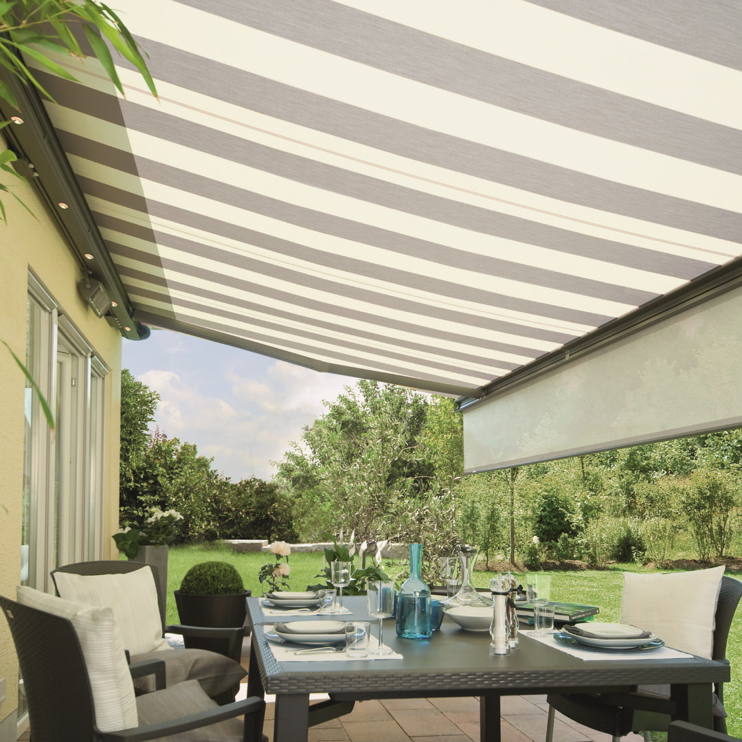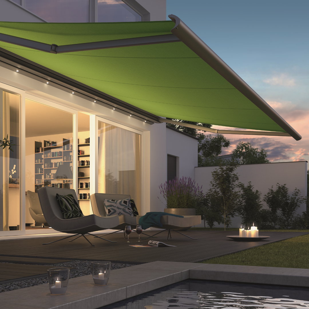 Mit Volant Plus und integrierter LED-Beleuchtung wird die Opal Design II höchsten Ansprüchen gerecht. Mehrfeldanlagen verwandeln auch große Terrassen in einen schattigen Lieblingsplatz.