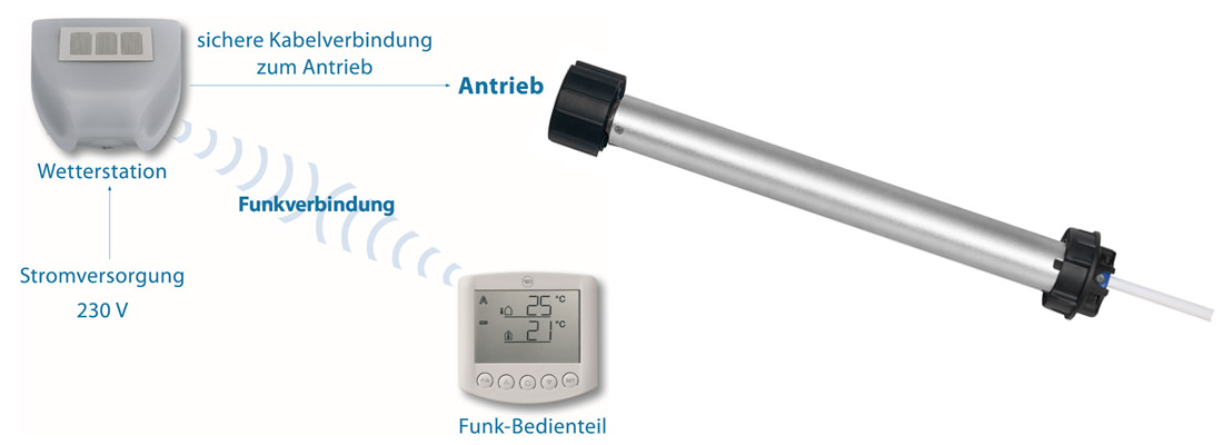 - Zeit-, Sonnen-, Morgen- und Abenddämmerungsautomatik per Funk steuerbar